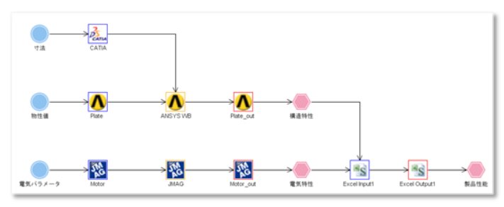 各種シミュレーションツールやExcel, 内製プログラムなどの自動実行環境を構築できます。また、ポスト処理機能を用いて自動実行や最適化計算により収集したデータを分析することができます。