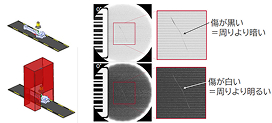 微細な表面欠陥の検出に優れており、電子部品や半導体のクラック検出、食品や医薬品の異物混入検査、自動車部品の塗装ムラやバリ検出などに最適です。