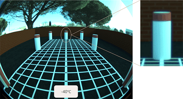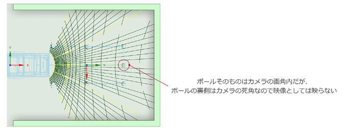 図9は常温20℃における見栄えシミュレーションの結果です。図8のグリッドで見たとおり、ポールの陰は当然見えませんし、車体の手前にある両側のポールは画角内に収まって映っています。