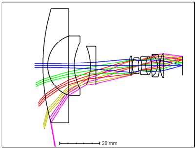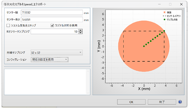 このモデルに対して、OpticStudioのマルチコンフィグレーション機能を活用し、複数の温度環境を設定します。この機能により、ひとつの光学モデルに対して一部のパラメータが異なる複数の構成を定義できます。温度変化に伴ってレンズの形状・厚み・屈折率が変化する複数のモデルができあがりますので、それぞれに対してROMを生成します。なお、今回のセンサーサイズは7.5332mm×5.6351mmとして、その対角の長さに基づいて光線経路情報を作成します。