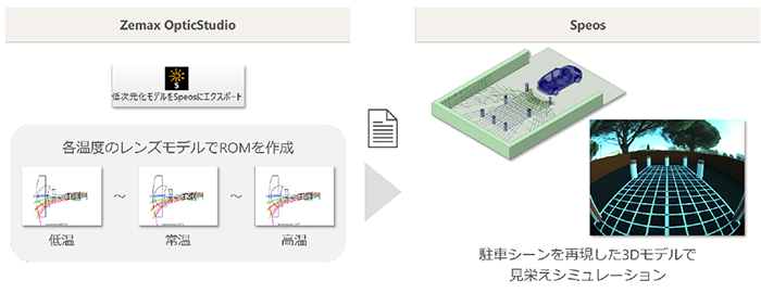 本事例では、低温から高温まで計7パターンの温度環境に対応したROMを作成し、それぞれに対してカメラシミュレーションを実施、温度変化による見栄えの違いを可視化しています。図3はその解析プロセスの概要を示しています。