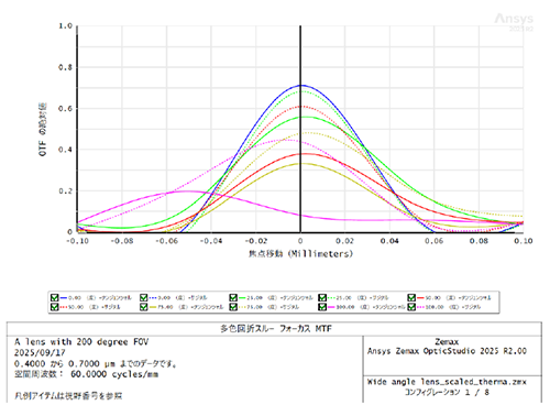 今回は、常温20℃モデルを基準とし、空間周波数60lp/mmの軸上画角におけるMTF値が最大となるように像面位置を設定しています。