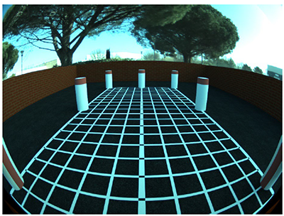 3DモデルとROMのインポートが完了したら、シミュレーションを実行します。Speosでは、外観を確認する「見栄えシミュレーション」に加え、カメラの画角をグリッドで投影するシミュレーションも可能です。図8は、常温20℃における画角グリッド投影の結果を示したものです。例えば、路面には広範囲にわたってグリッドが投影されており、7本のポールもすべて画角内に収まっていることが確認できます。ただし、ポールの裏側はカメラから見えない死角にあたるため、グリッド線は描画されていません。このように、設計データ上の画角が3Dモデルに対してどのように適用されるかを視覚的に確認することが可能です。次に、この画角通りに撮影できるかどうかを、見栄えシミュレーションで検証します。