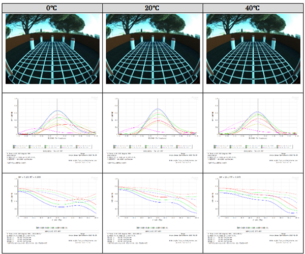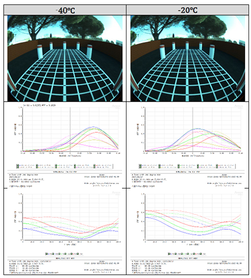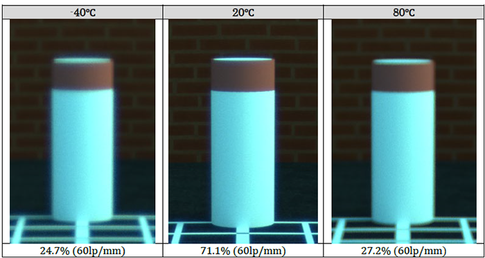 図10のアニメーションでは、低温から高温にかけての解像度の変化をご覧いただけます。実際の使用環境において車載リアビューカメラが温度の影響を受けると、シミュレーションのとおり解像性能が変化することが確認できます。