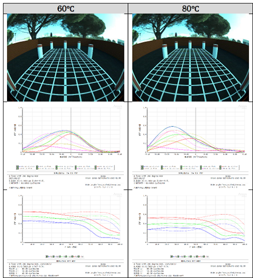 低温(-40℃、-20℃、0℃)、常温(20℃)、高温(40℃、60℃、80℃)の計7種類の温度環境における、Speosを用いた見栄えシミュレーション結果、およびOpticStudioによるスルーフォーカスMTFならびに視野に対するMTFの解析結果を表2に示します。スルーフォーカスMTFは空間周波数60lp/mm、視野に対するMTFは60lp/mm(青線)、50lp/mm(緑線)、40lp/mm(赤線)の3条件でプロットしています。20℃環境下で軸上画角にピントを合わせたモデルを基準に比較したところ、温度によってスルーフォーカスのピーク位置が前後に移動しており、視野全体においてもMTFの変動が顕著に見られました。
