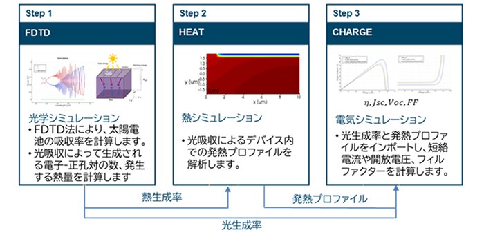 まずLumerical FDTDにより光吸収を解析して光生成率・熱生成率を算出し、Lumerical HEATで温度分布を導出、さらにLumerical CHARGEで発熱や再結合を考慮したJ–V特性を取得しました。