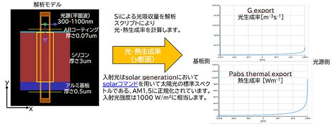光学シミュレーションでは、シリコン太陽電池に入射する太陽光の吸収による光子生成と熱生成を計算します。