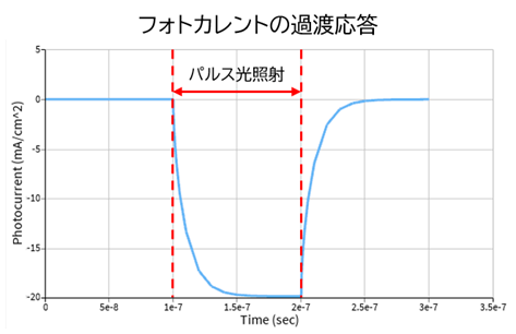 パルス光を与えて電流の時間応答を解析します。フォトカレントの立ち上がり・立ち下がりや応答速度を評価します。