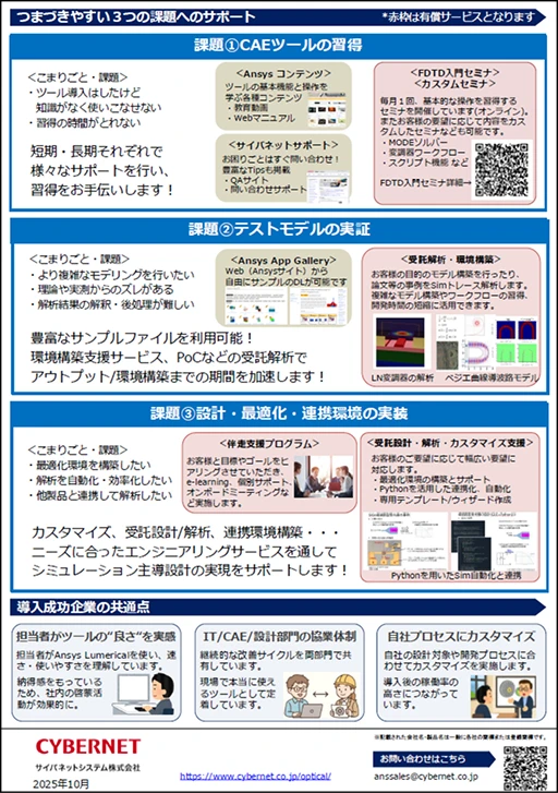 フォトニクスシミュレーションに特化した Ansys Lumerical は、ナノ・ミクロレベルの光学デバイスからシステム全体までを高精度に解析できる強力なツール群です。しかし、単にツールを導入するだけでは、その効果を十分に発揮できません。 本資料では、「CAEツールの習得」「テストモデルの実証」「設計・最適化・連携環境の実装」という、導入時につまづきやすい3つの課題に着目し、Ansys Lumerical導入を成功させるポイントをわかりやすくまとめました。