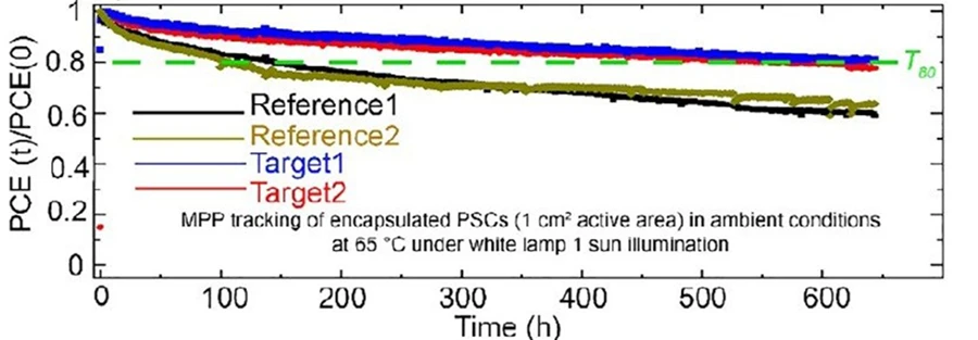 また、65℃環境下(大気環境、カスタムされた環境チャンバーを使用)において、1SUN相当の白色ランプ照射下で試験を実施したところ、活性領域1cm²の封止デバイスにおいて、T80(初期変換効率の80%に低下するまでの時間)が600時間を超えることが確認されました(図2)。