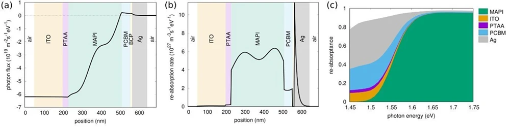 詳細つり合いモデルや熱力学に基づく従来のフォトンリサイクリング評価手法とは異なり、本手法では寄生吸収を直接計算する必要がありません。また、局所的な再吸収速度を直接計算できるため、複雑な積層構造をもつデバイスでも、各層で発生する寄生吸収を容易に定量化できます(図2b)。さらに、外部放射の利用効率と同様に、各層の再吸収速度をデバイス全体の内部発光速度で規格化することで、層ごとの再吸収の割合(layer-resolved re-absorptance)を求めることができます(図2c)。