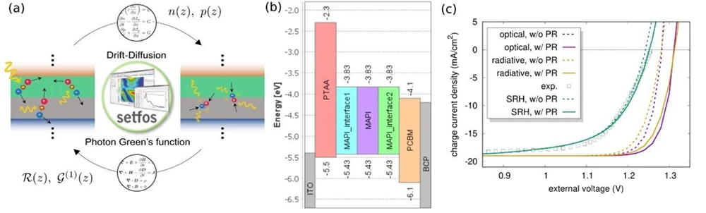 一例として、文献[3]の太陽電池デバイス構造を対象に電流–電圧特性(J–V特性)を評価しました。この解析では、デバイス中の電荷輸送を考慮しており、その領域にはコンタクト層および電荷輸送層が含まれます。また、MAPI 吸収層の界面に存在する欠陥による非放射再結合の影響もモデルに組み込んでいます(図3b)。解析はグリーン関数モデルで求めた光学的レートを、Fluxim AGの光電子デバイスシミュレーションツール「Setfos」へ入力し、実施しました。非放射再結合が一切ない放射限界条件で光学・電気シミュレーション(optoelectronic simulation)を行うと、フォトンリサイクリングにより、Voc の増強は確認できたものの、擬フェルミ準位分裂の外部電圧依存性が単純ではないため、曲線因子(fill factor、FF)はわずかに低下しました(図3c、黄線)。さらに、界面欠陥における非放射再結合の影響を評価するため、J–V 特性の実験結果に基づいて推定した欠陥パラメータを用いてシミュレーションを行った結果、フォトンリサイクリングによるVoc の増強効果が大幅に低下することが明らかになりました(図3c、緑線)。