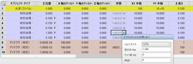 以上を踏まえ、参考文献に基づいて、本稿での解析に用いる皮膚の層構造および光学パラメータを、表1に上層から下層の順でまとめます。最下行には血液の光学パラメータを記載しています。図1ではOpticStudioで皮膚の層構造をオブジェクトで再現した様子を示しています。OpticStudioでは、皮膚を矩形体積オブジェクトとして表現し、血液は独立したオブジェクトとしてはモデル化しません。その代わりに、各皮膚層の材質として設定する屈折率により、血液の影響を反映させています。