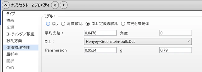 図2はOpticStudioでHenyey-Greenstein散乱を設定する実際の画面です。表皮に対する設定画面を示しています。