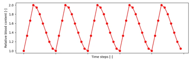 図3は、本解析における血液量の相対値の時間変化をプロットしたものです。なお、本解析では計算負荷とのバランスを考慮して上記の設定を採用していますが、解析条件を調整することで、より細かな時間分解能や、より長い周期にわたる結果を得ることも可能です。