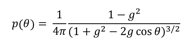 さらに、光が人体の中で発生させるバルク散乱も定義します。生体組織などの混濁媒質内の微粒子による散乱は、Henyey-Greenstein分布関数で再現できます。この散乱光の角度分布は下記式で求められます。