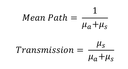 OpticStudioではHenyey-Greenstein散乱DLLで散乱を再現します。この際、参考文献に発表されている現実的な値に基づいて各層の散乱パラメータを設定しています。散乱の入力パラメータは平均光路(Mean Path)、透過率(Transmission)、異方性パラメータgです。一方、参考文献では一般的に、異方性パラメータとともに散乱係数μsと吸収係数μaが掲載されています。このため、モデルの入力パラメータである平均光路と透過率を、散乱係数μsと吸収係数μaで次式のように計算しました。