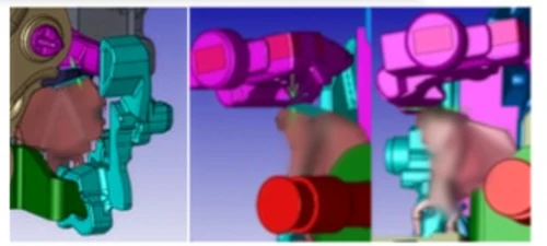 対象となったのは、ドアラッチ内部の部品です。この部品は3次元的に斜めに配置され、周辺の複数部品と複雑なクリアランス関係を持っていました。 従来のCADベースの手作業では、立体的なばらつきを正確に把握することが難しく、試作段階で干渉が発覚するリスクがありました。