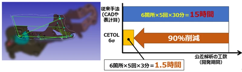この事例では、1つのモデルで6箇所の公差について、それぞれ約5回ずつ公差値を変更して検討を実施しました。従来であれば約15時間を要していた作業が、CETOLでは約1.5時間で完了し、解析工数を約90%削減することができました。