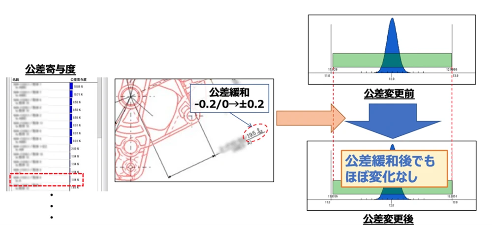 さらに、量産品の実測データが蓄積され、単品寸法のばらつき実力を把握できるようになれば、統計的根拠に基づいた、より踏み込んだ公差緩和も視野に入ってきます。